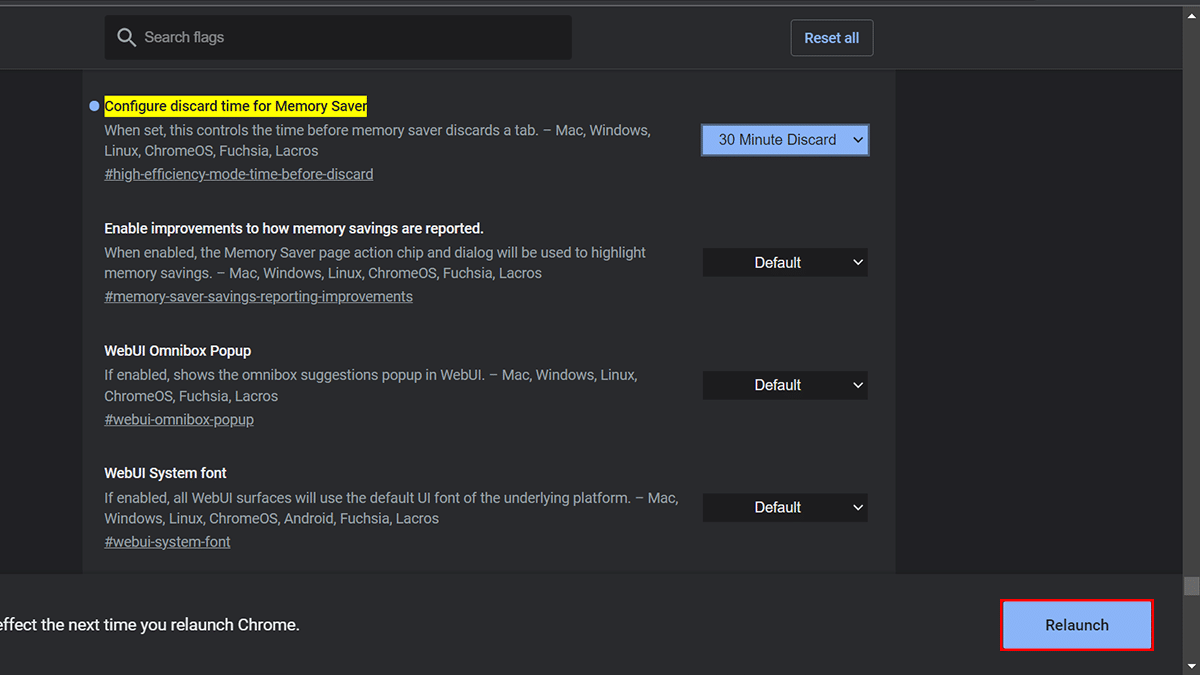 - Utilize o “Configurar o tempo de descarte para Memory Saver”Configuração à direita> escolha quando descartar guias inativas.