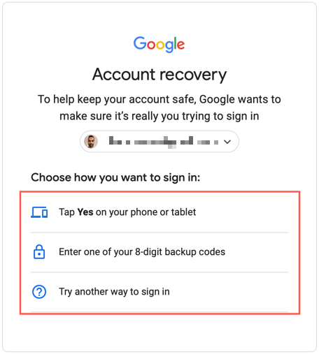 - Códigos de backup: use um dos oito códigos alternativos usados ao configurar a verificação em duas etapas para sua Conta do Google.