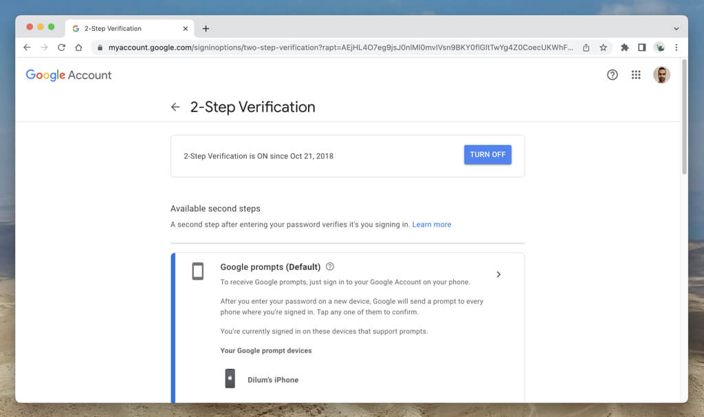 A verificação em duas etapas adiciona uma camada extra de segurança à sua conta, exigindo que você toque em um prompt ou use um código enviado ao seu dispositivo móvel antes de acessar sua conta. Você também pode vincular a verificação em duas etapas aAutenticador Google.