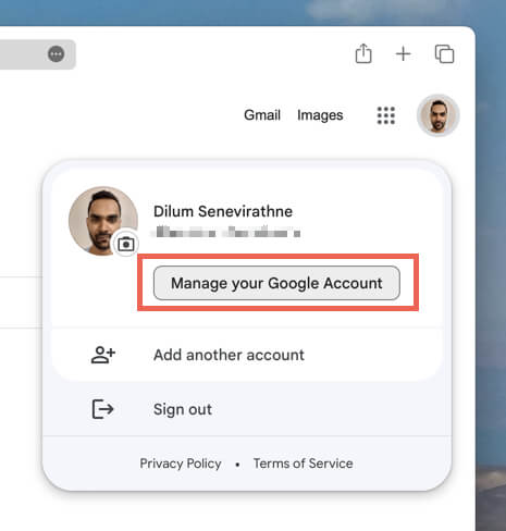- Abra um navegador da web, visite oPágina de login da Conta do Googlee faça login em sua Conta do Google. Se você já estiver conectado a um serviço do Google (por exemplo, Gmail, Pesquisa ou Fotos), selecione o ícone da foto do seu perfil no canto superior direito da página da web e escolhaGerencie sua Conta do Google.