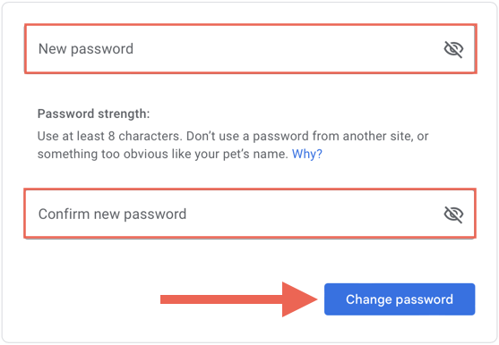 - Digite sua nova senha, confirme-a e selecioneAlterar a senha.