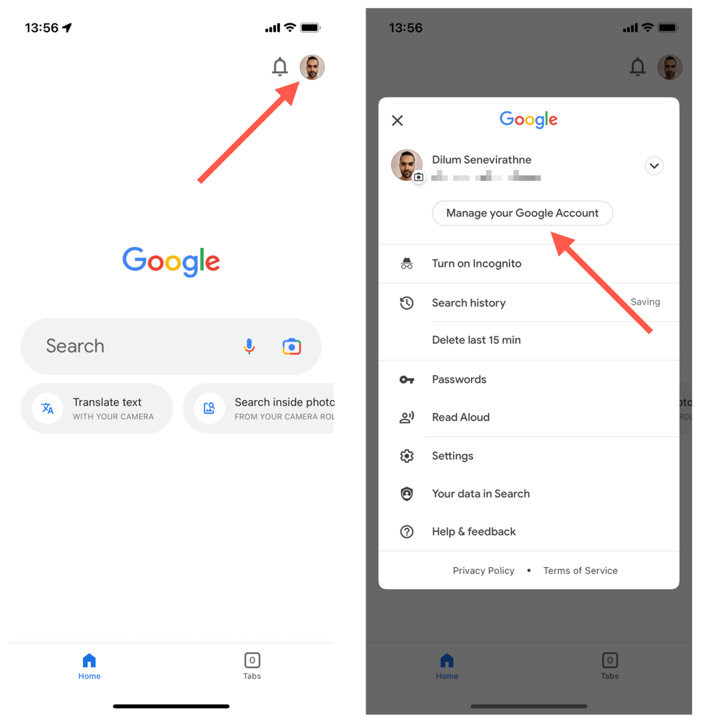 Em dispositivos iOS, você pode alterar a senha da Conta do Google por meio de aplicativos do Google, como Gmail, Google Fotos e Chrome. Para fazer isso: