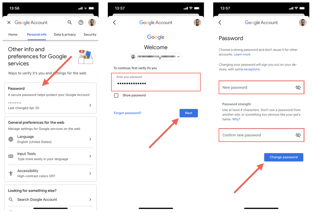 Se você não tiver nenhum aplicativo do Google no seu iPhone, faça login na sua Conta do Google por meio de um navegador como Safari ou Chrome e visite a tela de configurações de segurança da conta para alterar sua senha.