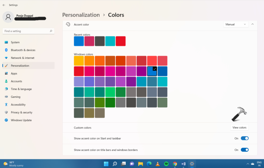 6.Se você deseja alterar a cor de destaque atual, escolha oManualopção doCor de destaquemenu suspenso. Agora, escolha o bloco de cor de sua preferência para aplicar a mesma cor à barra de tarefas.