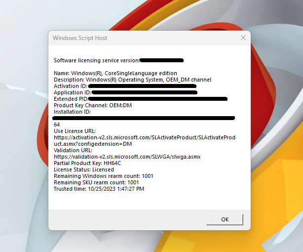 5.Depois de acertar odigitarbotão, você obterá a tela listada abaixo comdetalhes adicionaisda versão do Windows 11 no seu dispositivo. Isso incluirá o ID de ativação, o ID do aplicativo, a chave de licença e muito mais.