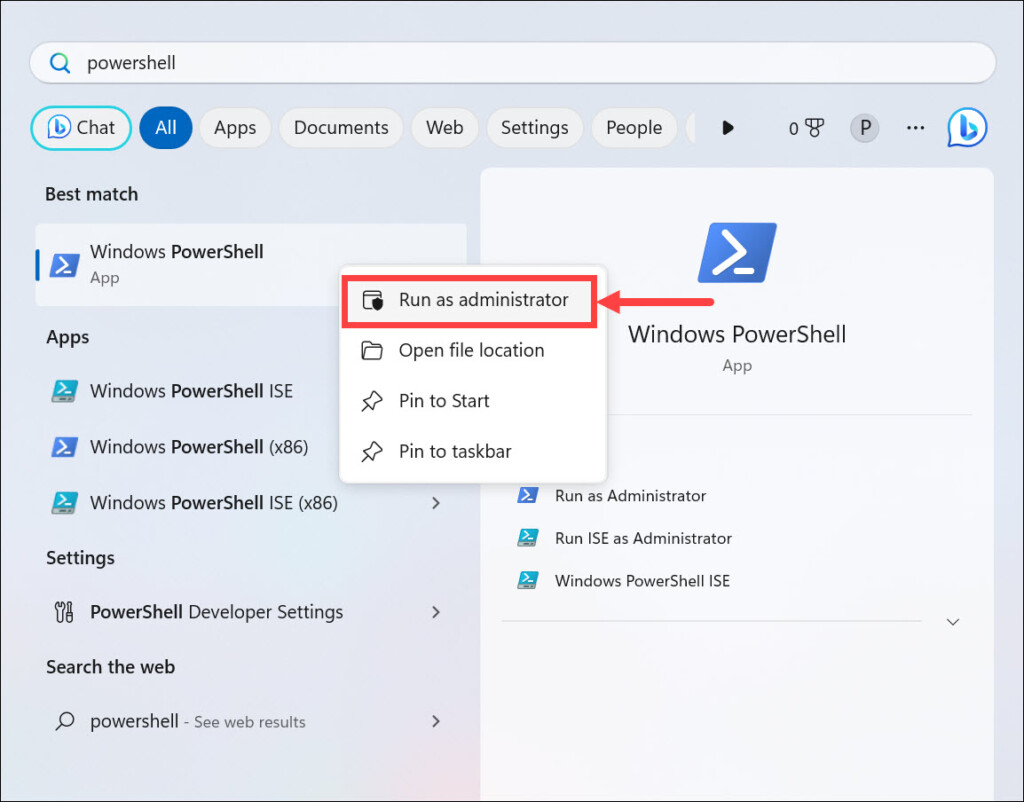 1.Digite “Windows PowerShell” na caixa de pesquisa, clique com o botão direito em seu ícone e selecioneExecutar como administrador.