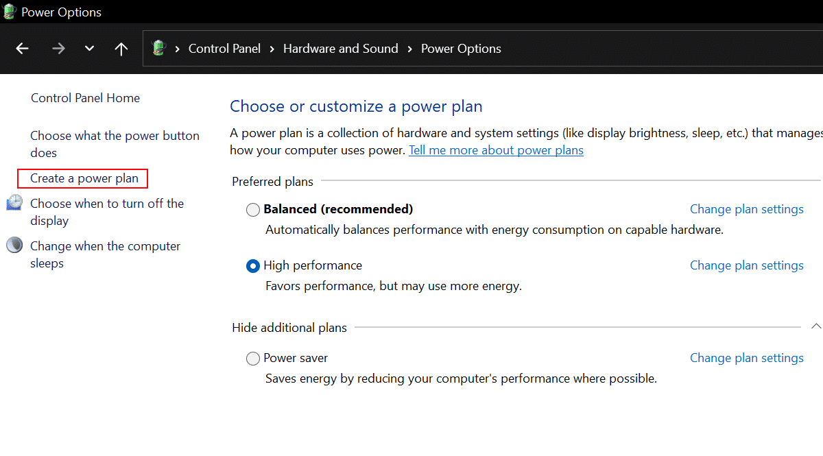 - Clique noCrie um plano de energiabotão no painel esquerdo.