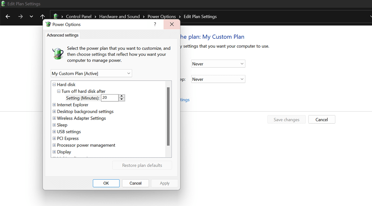 - Disco rígido: Esta opção é para computadores com disco rígido de prato giratório tradicional que podem usar a opção “Disco rígido” para especificar quando desligá-lo.