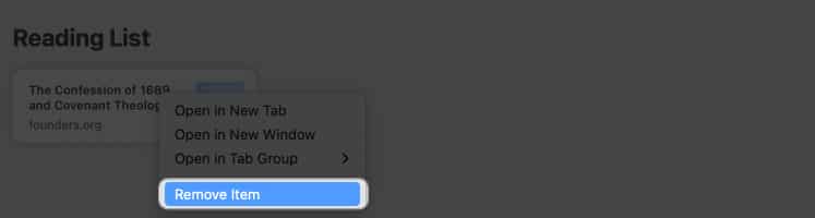 Você precisa excluir manualmente cada item para removê-los da página inicial do Safari. Isso funciona para itens noLista de leitura,Favoritos, eSites frequentemente visitados. Basta clicar com o botão direito no item que deseja excluir e selecionar Excluir ou Remover Item.