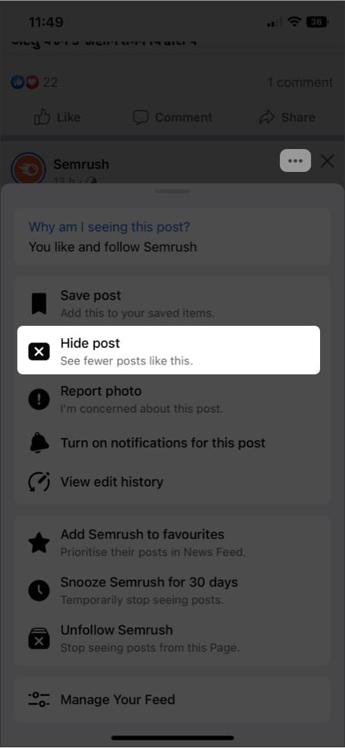 Um menu pop-up aparecerá alguns segundos depois de ocultar a postagem. Então você pode dar um passo adiante e adiar a postagem oculta por um horário específico. NoPostagem ocultamenu, você podeAdiar por 30 dias.