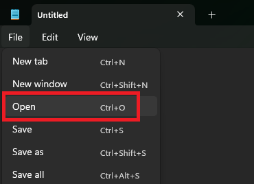 3.No aplicativo Bloco de Notas, clique no botãoArquivoopção e selecioneAbrir. Você também pode pressionarCtrl+Opara abrir um arquivo.