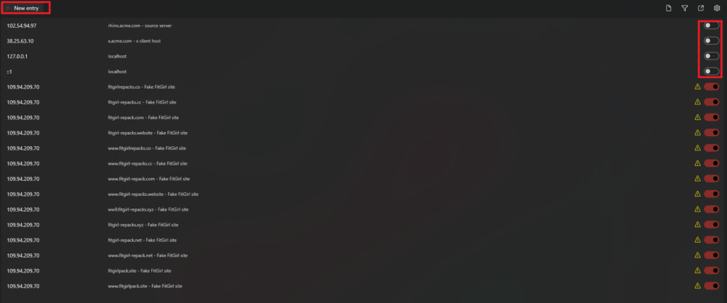4.Clique noNova entradabotão para adicionar um novo endereço IP e domínio. Você também pode ativar ou desativar qualquer entrada usando os botões fornecidos.