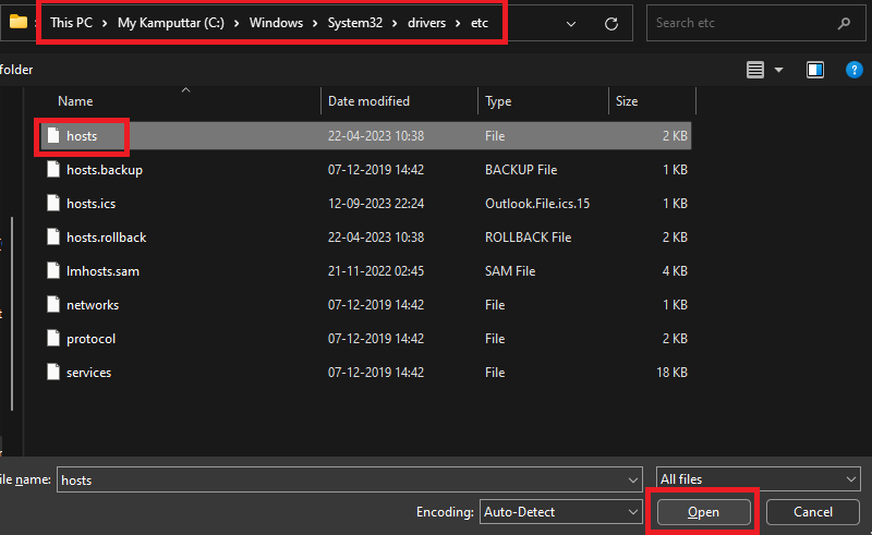 C:WindowsSystem32driversetc6.Selecione oanfitriõesarquivo e clique noAbrirbotão.