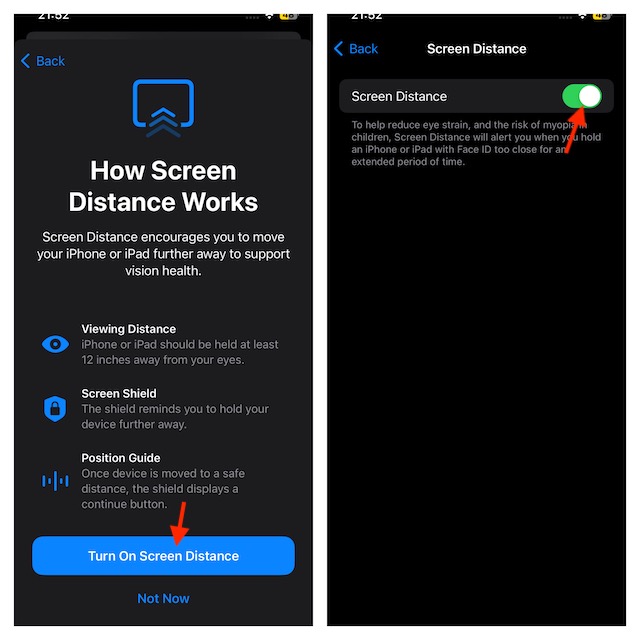 - A alternância “Distância da tela” agora será ativada e será ativada no seu iPhone.