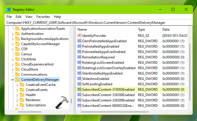 HKEY_CURRENT_USERSoftwareMicrosoftWindowsCurrentVersionContentDeliveryManager
