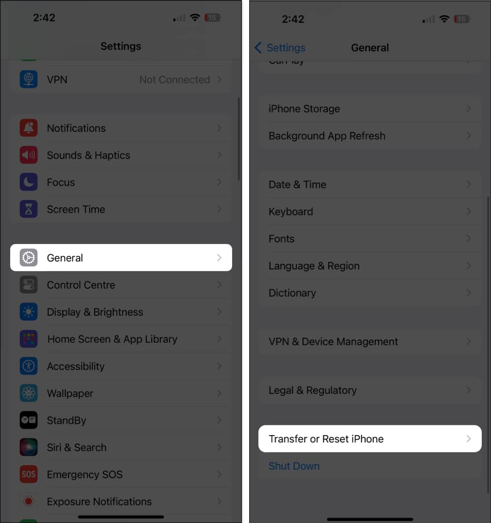 Quando você vai paraConfigurações→Em geral→Transferir ou redefinir o iPhone, você encontrará as seguintes opções: