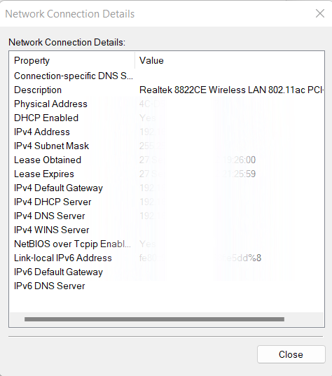 Você poderá ver os detalhes de DNS IPv4 e IPv6 para esta conexão de rede.