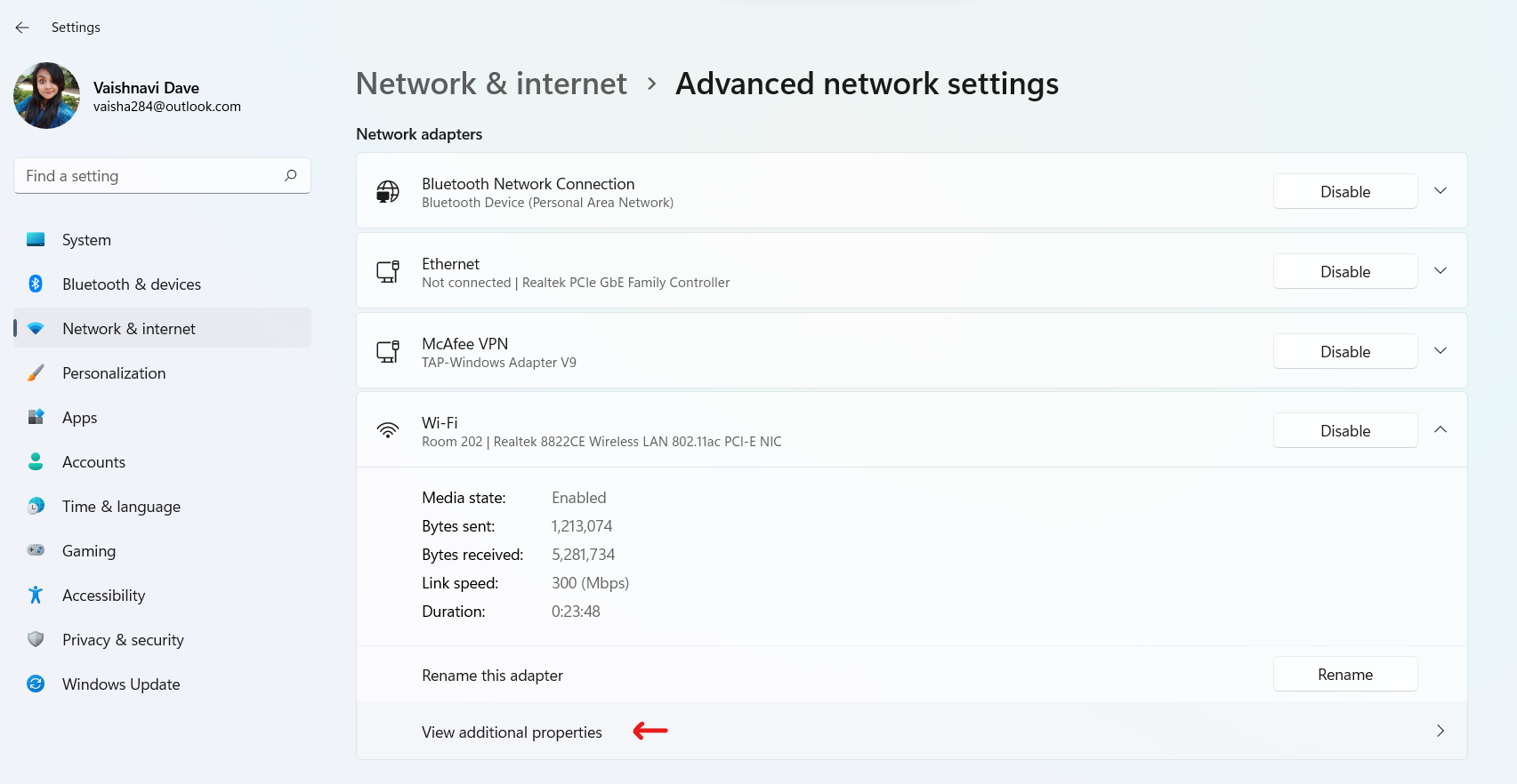 - Aqui, na lista de adaptadores de rede, escolha aquele cujos detalhes você deseja saber. Depois de expandir, clique emVeja propriedades adicionais.