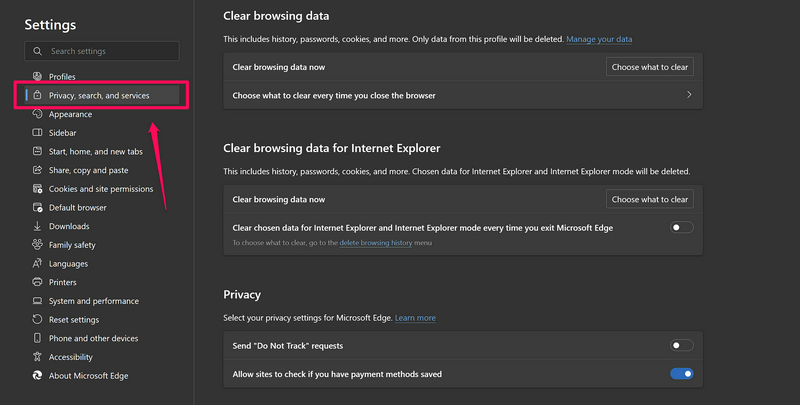 3.Vá para oGuia Privacidade, pesquisa e serviçosna barra de navegação esquerda.