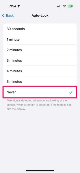 4.Agora, toque noNuncaopção na parte inferior paradesativar a configuração de bloqueio automáticono seu dispositivo.