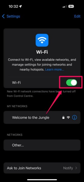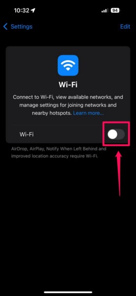 Outra solução simples que funcionou para resolver o problema de não funcionamento do AirPlay no iPhone para muitos usuários é desligar o recurso Wi-Fi e ligá-lo novamente. Isso pode eliminar qualquer falha relacionada à rede que possa estar causando o mau funcionamento do recurso AirPlay no iPhone e resolver o problema com alguns toques.