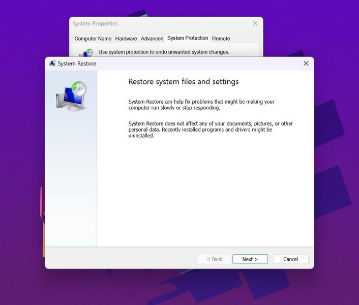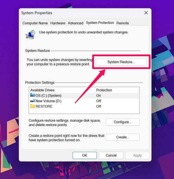 Agora, chegando ao último recurso para corrigir o problema de não funcionamento do Always On VPN no Windows 11 – uma restauração do sistema. Veja se você, em algum momento, criou um ponto de restauração do sistema em seu PC ou laptop com Windows 11, você está com sorte.