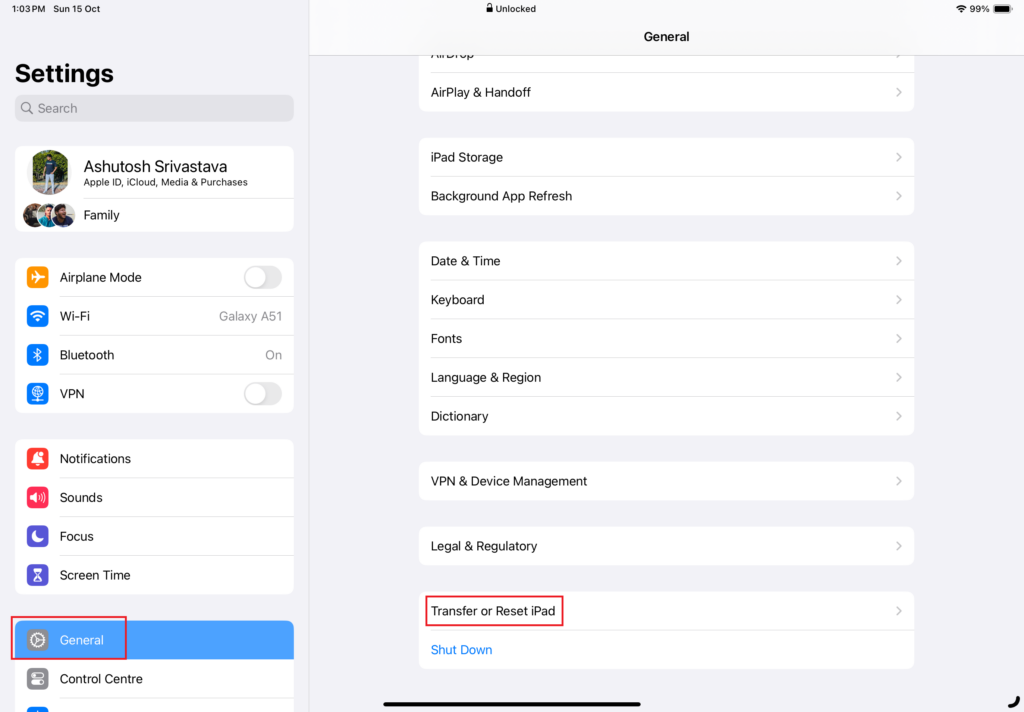3.Role para baixo e escolha oTransferir ou redefinir o iPadopção.