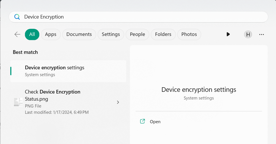 1.Abra oCaixa de pesquisa do Windows, tipoCriptografia de dispositivonele e selecioneCriptografia de dispositivo configurações.