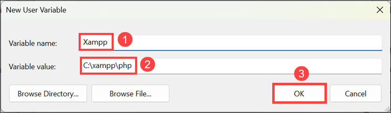 5.Insira o nome da variável e seu valor e clique emOK. Certifique-se de que no valor da variável, você colocou o caminho correto.