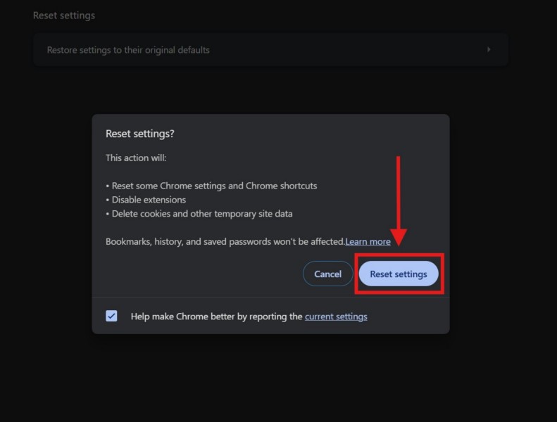 4.Clique noRedefinir as configurações para a opção padrão originalno painel direito.