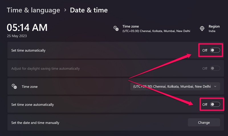 4.Aqui, certifique-se de que os botões de alternância para oDefinir fuso horário automaticamenteeDefinir hora automaticamenteas opções sãohabilitado.