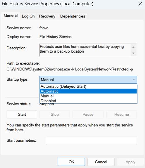 - O serviço Histórico de arquivos está desativado ou não definido como automático.