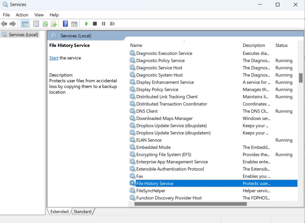 Um dos motivos comuns pelos quais você pode receber o erro “O histórico do arquivo não reconhece esta unidade” é que o serviço relacionado não está configurado corretamente. Aqui está como você pode verificar o mesmo –
