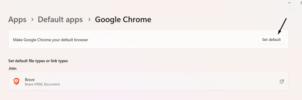 3.Na próxima tela, escolha oDefinir padrãobotão para definir o Google Chrome como navegador padrão.