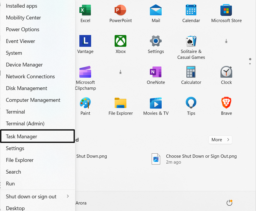 1.Clique com o botão direito noÍcone Iniciarna barra de tarefas do PC e escolha oGerenciador de tarefasopção dele.