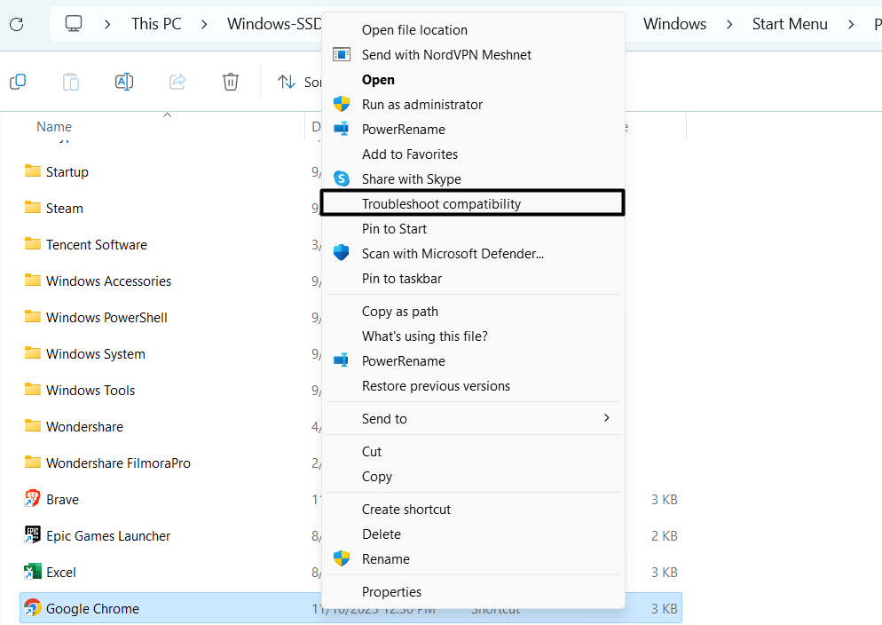 3.Na pasta, clique com o botão direito noGoogle Chrome aplicativoe escolha oSolucionar problemas de compatibilidadeopção.
