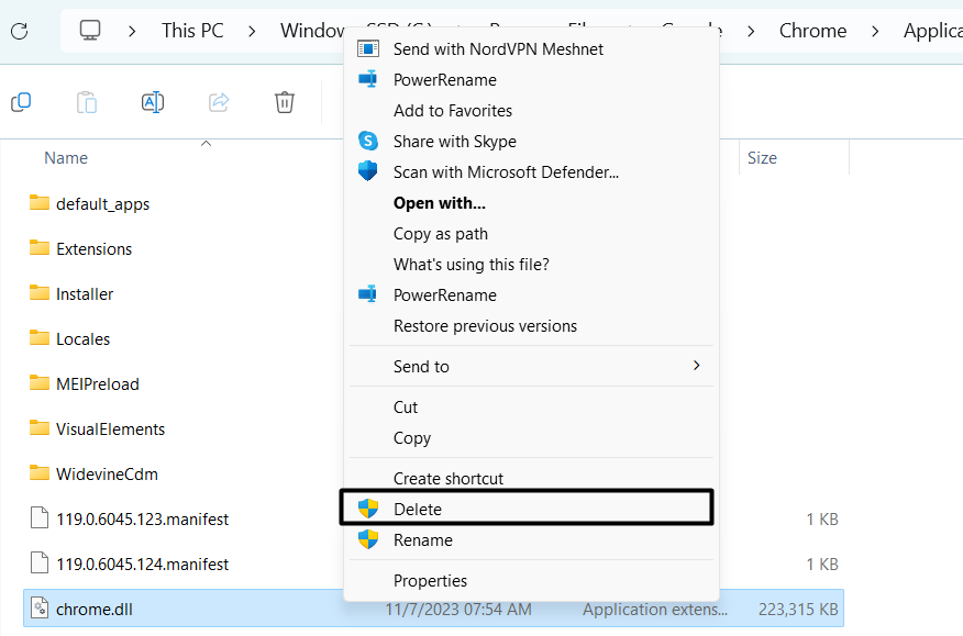 2.No mesmo local, encontre ocromo.dllarquivo, clique com o botão direito e escolhaExcluirdo cardápio.