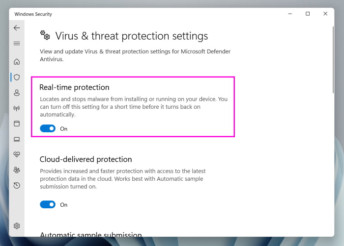 3.Na próxima tela, desative oProteção em tempo realalterne para desligar o utilitário antivírus.