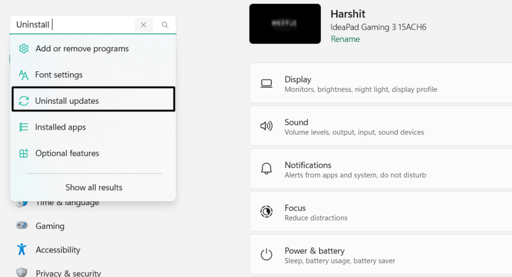 1.LançarConfiguraçõesno seu PC, digiteDesinstalar atualizaçõesna caixa acima do menu esquerdo e selecione-o.