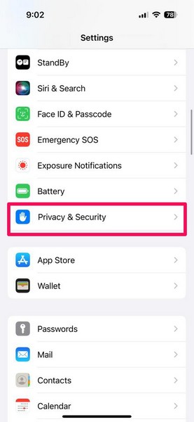 2.Localize oPrivacidade e segurançaopção na lista e toque nela para abrir.