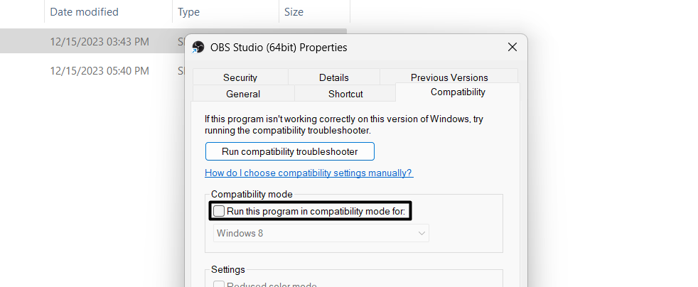 3.NoPropriedades do Greenshotjanela, vá para oCompatibilidadeaba e marque a opção abaixo: