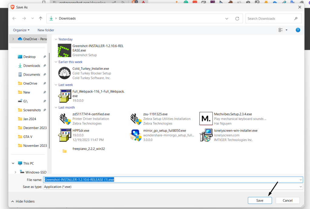 4.NoSalvar comojanela, escolhaSalvarpara baixar o arquivo executável do Greenshot no dispositivo.