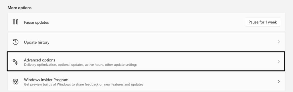 2.Vá para oAtualização do Windowsseção de Configurações à esquerda e escolhaOpções avançadas.