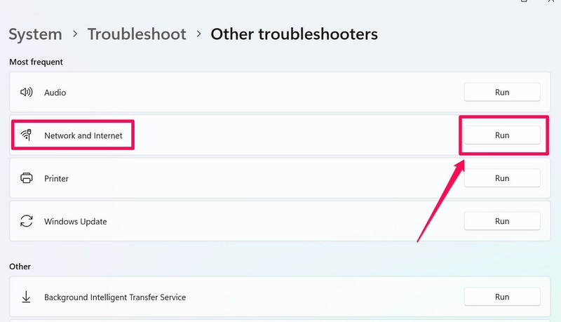 2.NoSolucionar problemastela, cliqueOutros solucionadores de problemas, e sobMais frequente, encontrarRede e Internet.