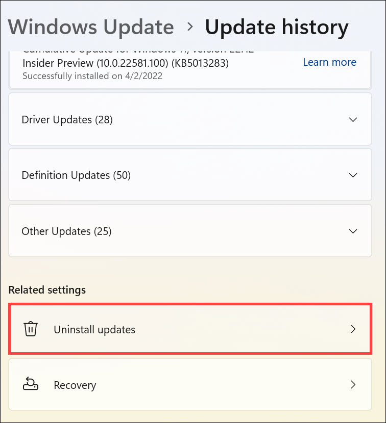 3.Procure oDesinstalar atualizaçõesopção abaixo de “Configurações relacionadas” e selecione-a.