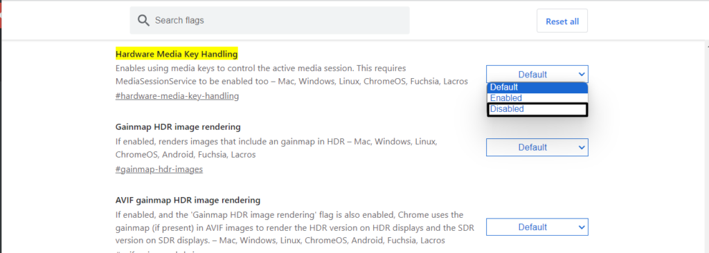 2.No fim, definir oManuseio de chave de mídia de hardwareopção paraDesativare feche a janela.