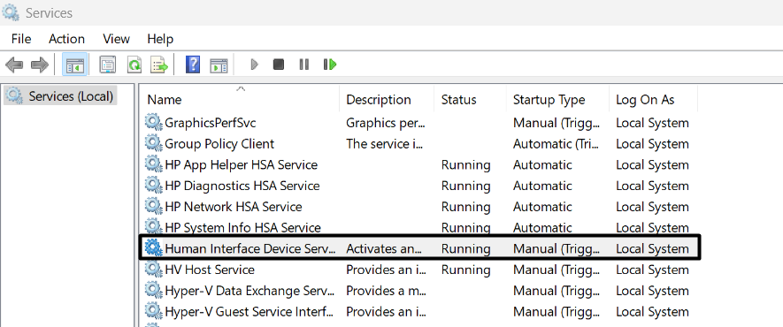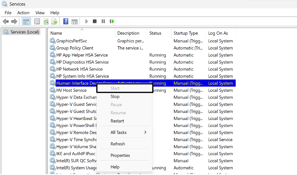 1.NoServiçosjanela, procure oDispositivo de interface humanaserviço e clique com o botão direito nele.