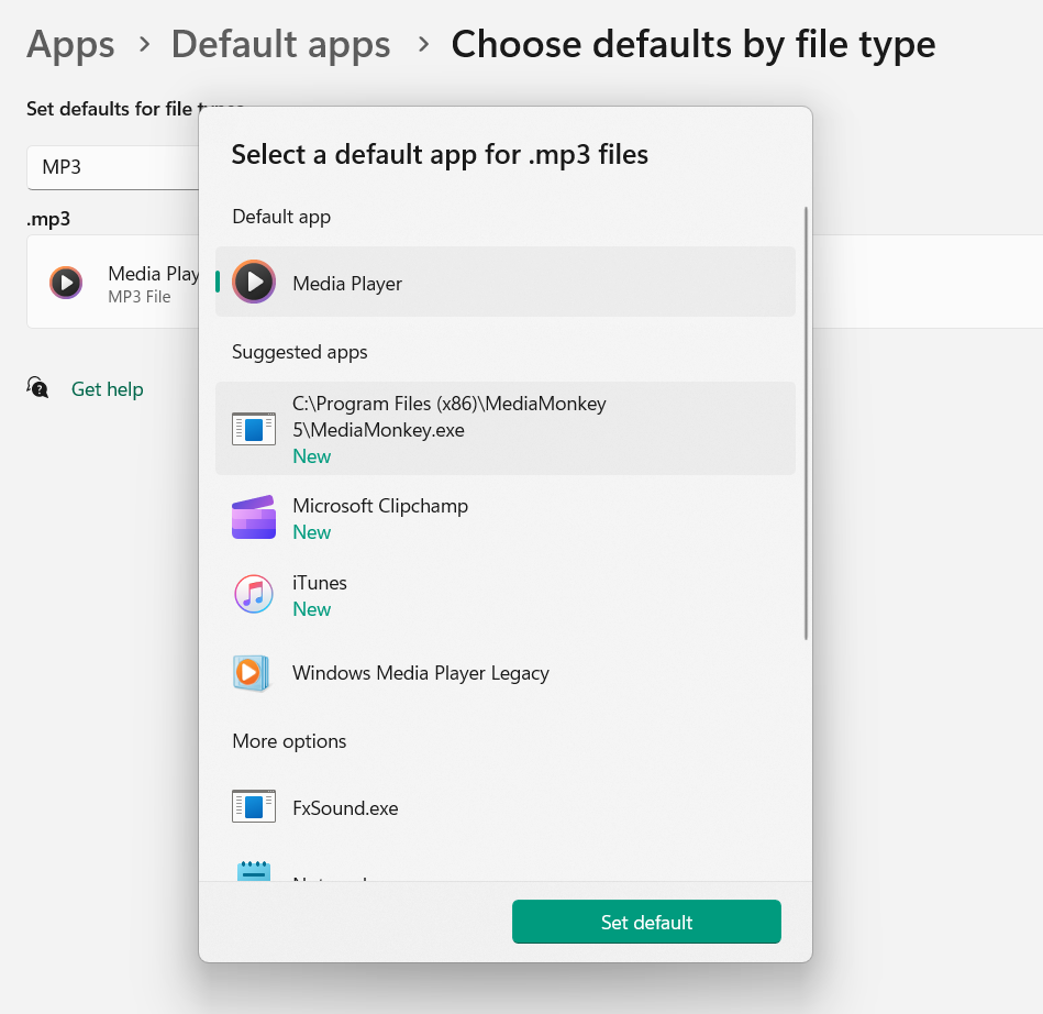 3.Escolha oEscolha os padrões por tipo de arquivoopção, procure oMP3tipo de arquivo e escolha-o.