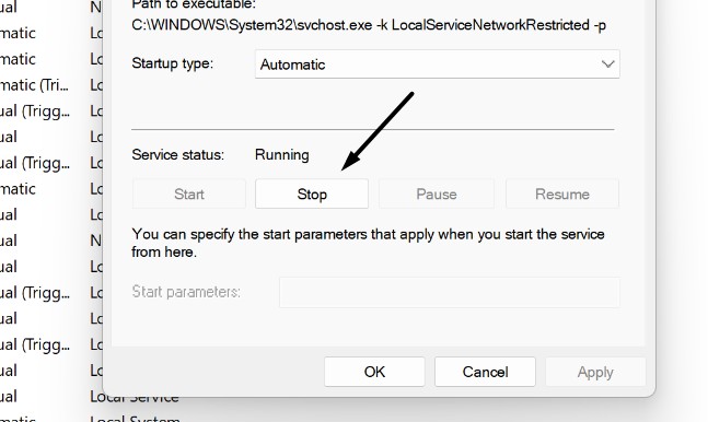 2.Escolha oPropriedadesopção no menu do botão direito e pressione o botãoPararbotão.