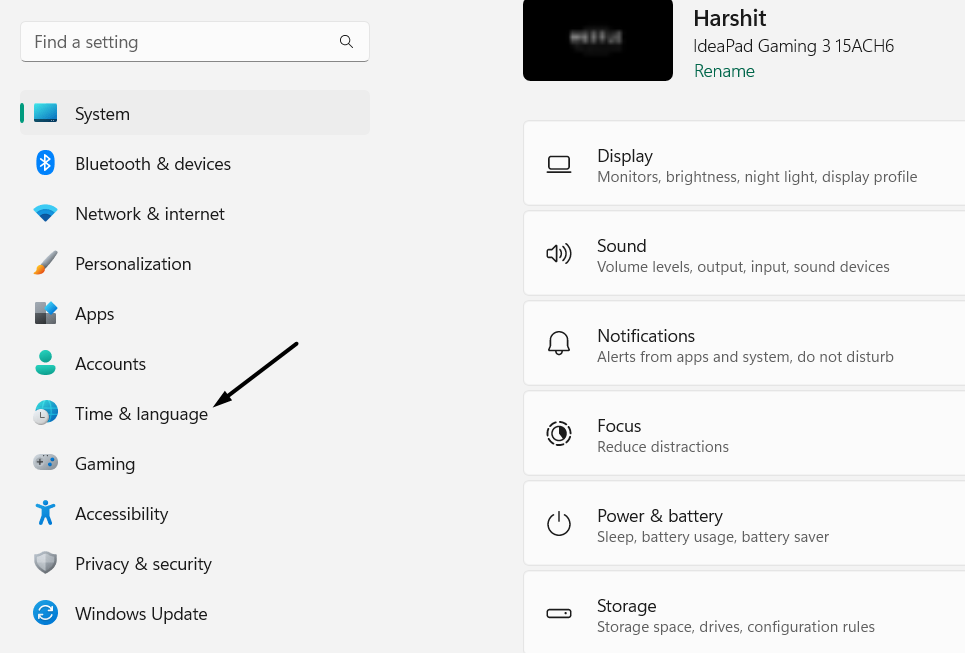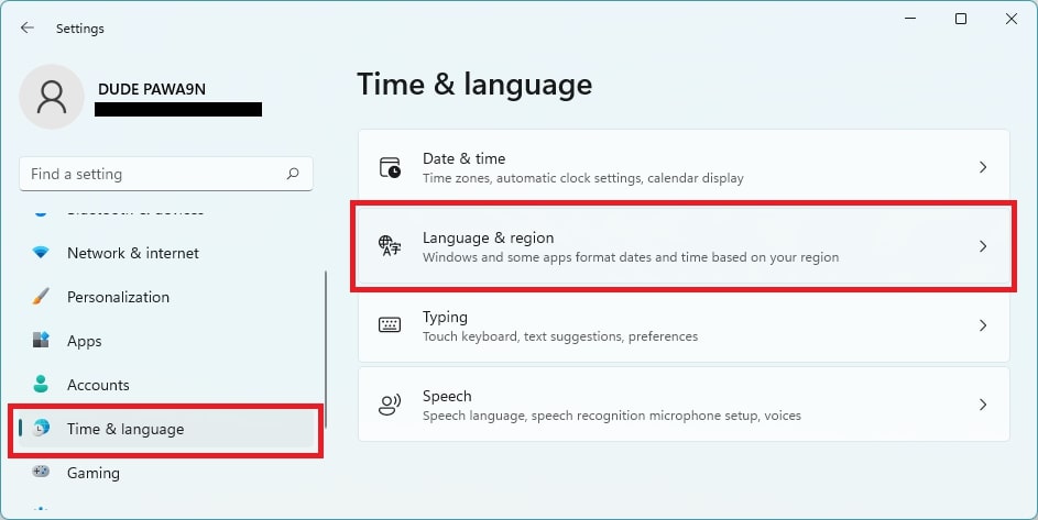 1.Pressione Windows + I para abrir oAplicativo de configuraçõese escolhaHora e idiomada esquerda.